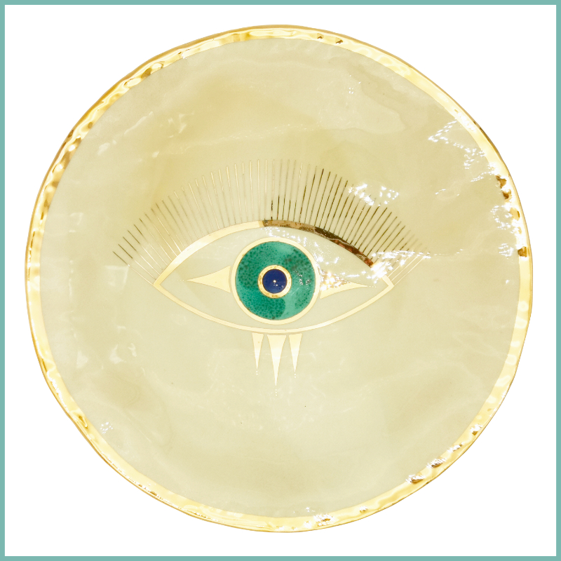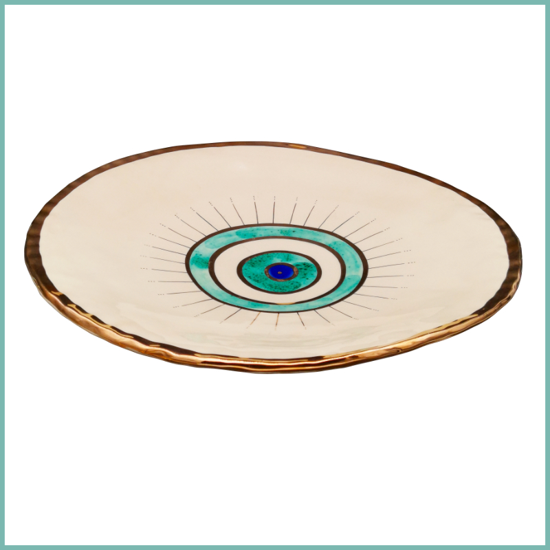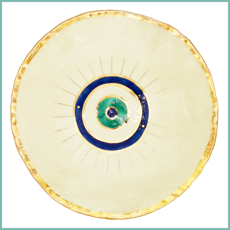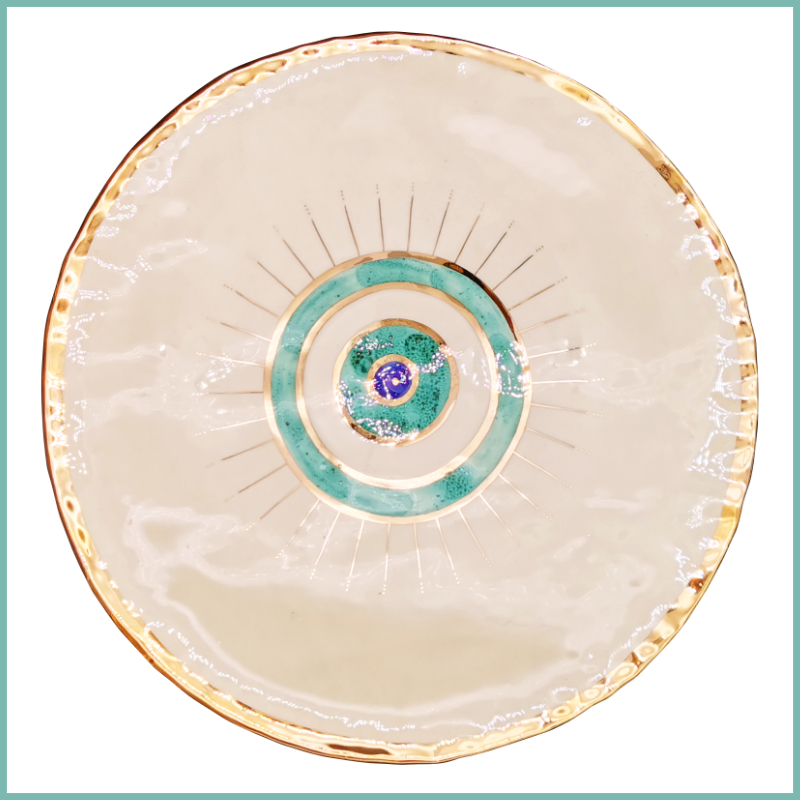 Tags Auge, bemalt, Creme, dekorativ, Geschirr, Gold, Groß, Keramik, Mittelgroß, Plattentechnik, Rund, Teller, Türkis