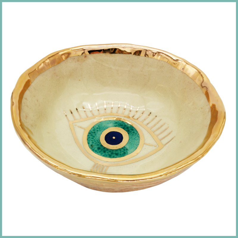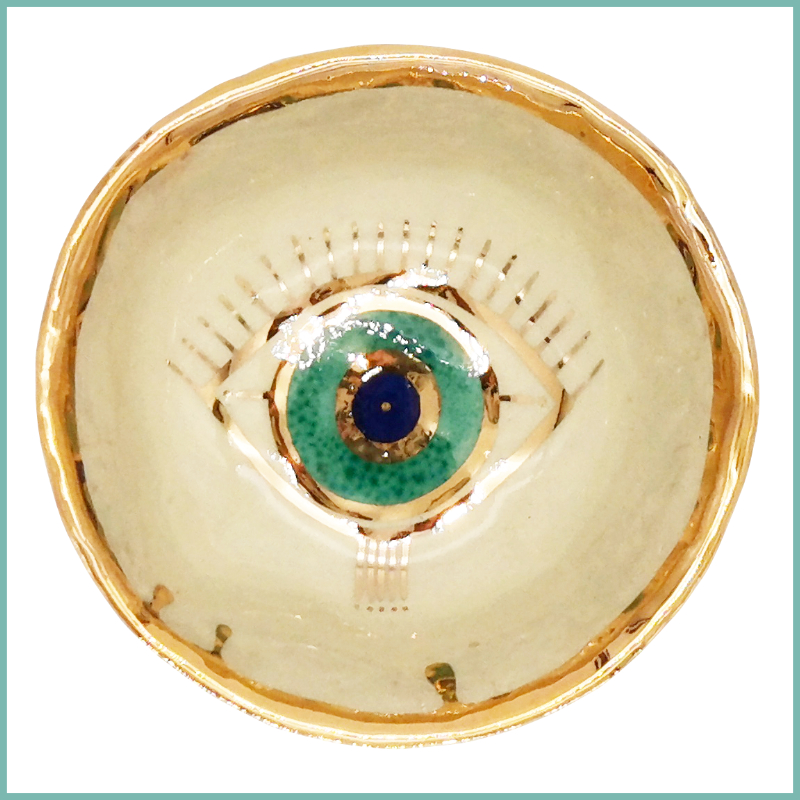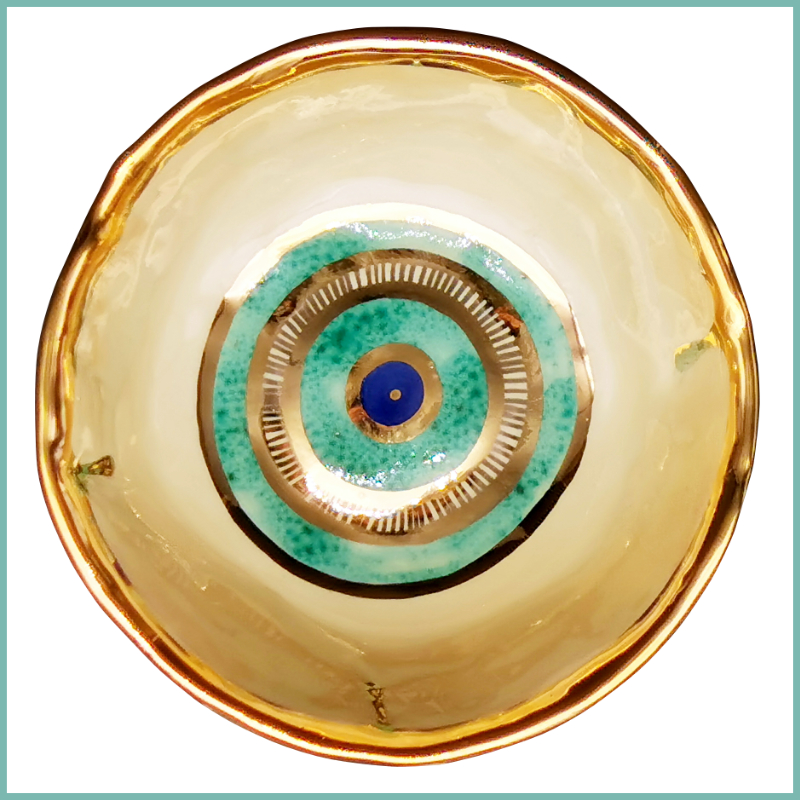 Tags Auge, Blau, Creme, Dekor, Gold, Interior rund, Keramikschale, Klein, Plattentechnik, Schale, Türkis, Wimpern