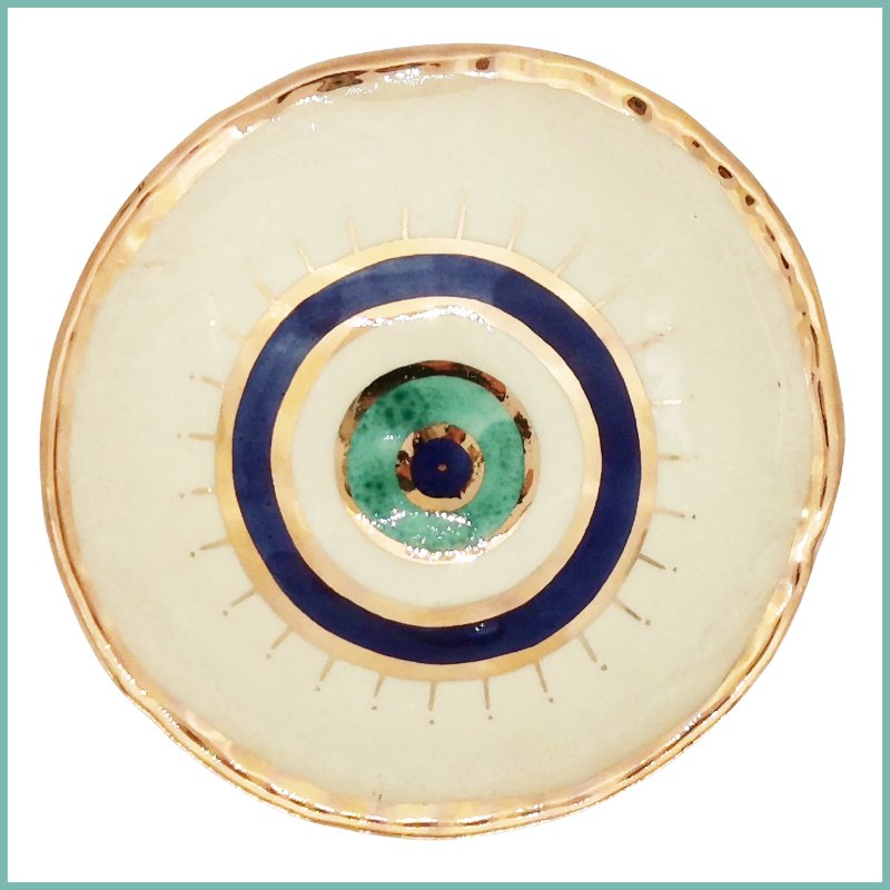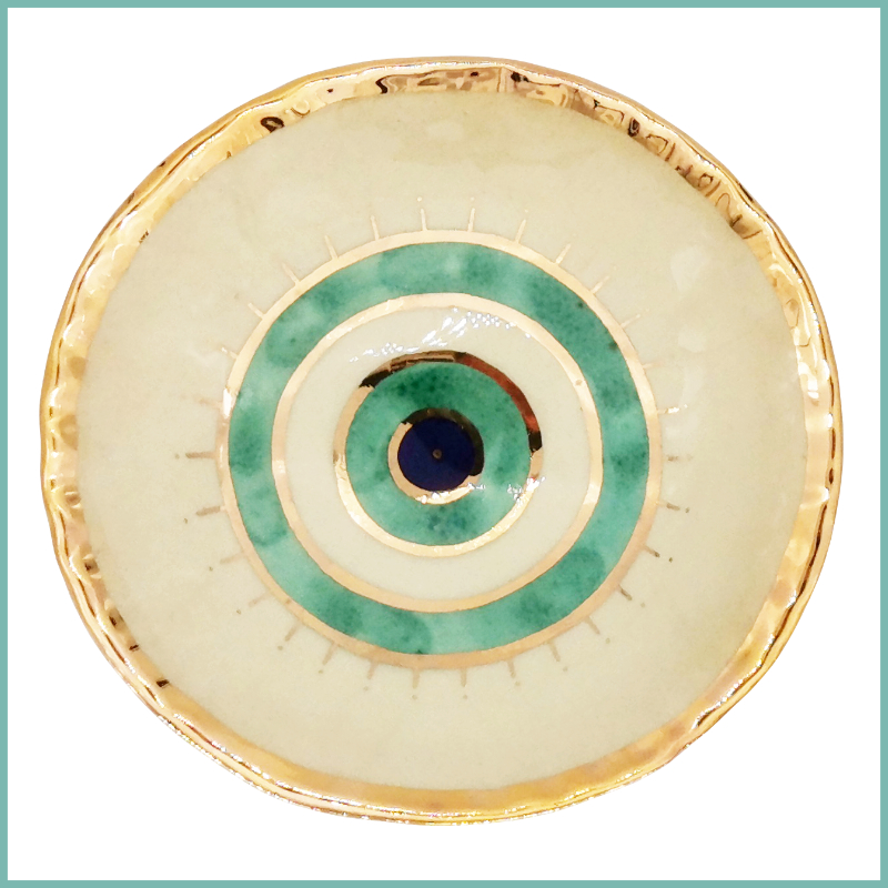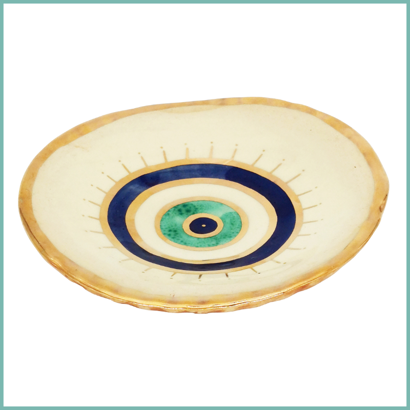 Tags Auge, bemalt, Creme, dekorativ, Geschirr, Gold, Keramik, Klein, Plattentechnik, Rund, Teller, Türkis