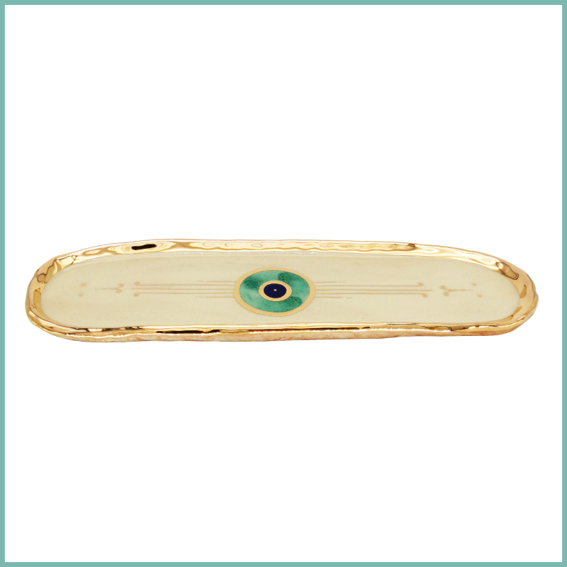 Kleiner, länglicher Servierteller in einzigartigem Design. Das sehende Auge schmückt diesen Servierteller auf einzigartige Art und Weise. Eine Kombination aus Blau, Türkis, Creme und Gold machen diesen Servierteller zu einem Highlight bei Ihrer nächsten Feier.