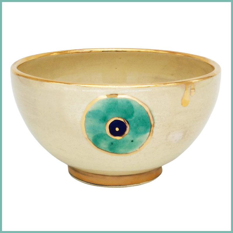 Mittelgroße runde Schale mit sehendem Auge und goldfarbenem Rand 15,5cm