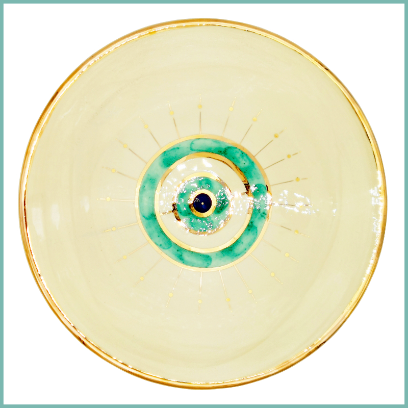Liebevoll, in Handarbeit auf Töpferscheibe gefertigter, cremefarbener Teller mit goldfarbener Umrandung und dem sehenden Auge als dekorative Zeichnung in der Mitte des Tellers. Die Augenfarbe ist Türkis mit goldfarbenen Außenlinien.